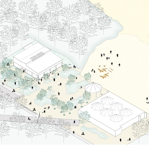 The huge boarding with inner lighting creates an intimate atmosphere in the double-height space. In the middle of the space a mirroring bar was placed in an organic shape. Above the heads of the visitors there is a square hall of mirrors reflecting the sky and the green museum esplanade.