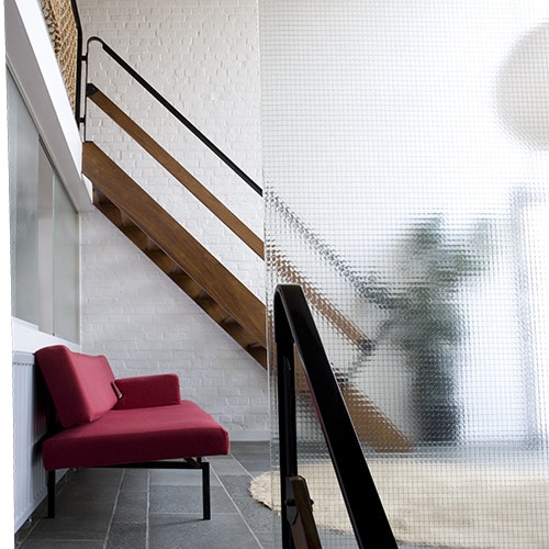 The south directed double glass wall functions as an entrance corridor and holds a winter garden. The northern wall, veneered on the inside, runs through the entire house making it a warm place both literally and figuratively speaking.